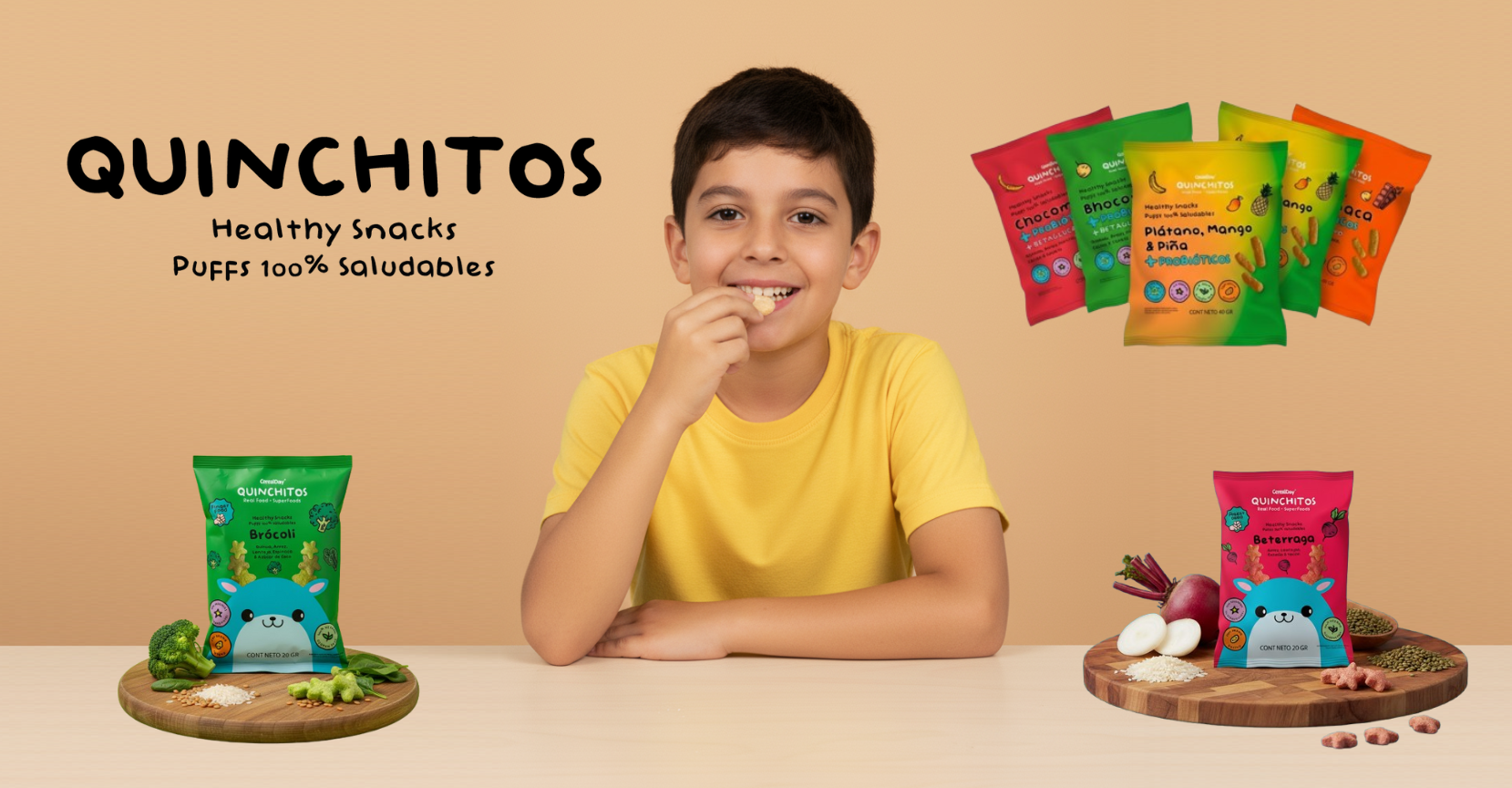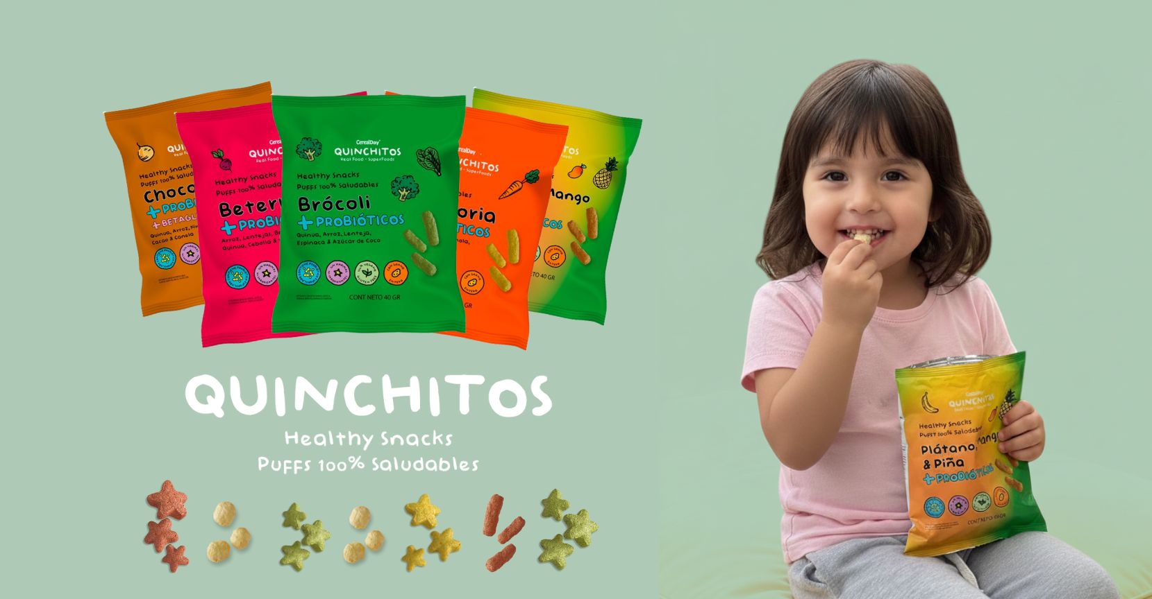 (20g) QUINCHITOS (PUFF) DE PLÁTANO, MANGO Y PIÑA A BASE DE QUINUA, KIWICHA, ARROZ, MAIZ, GARBANZO