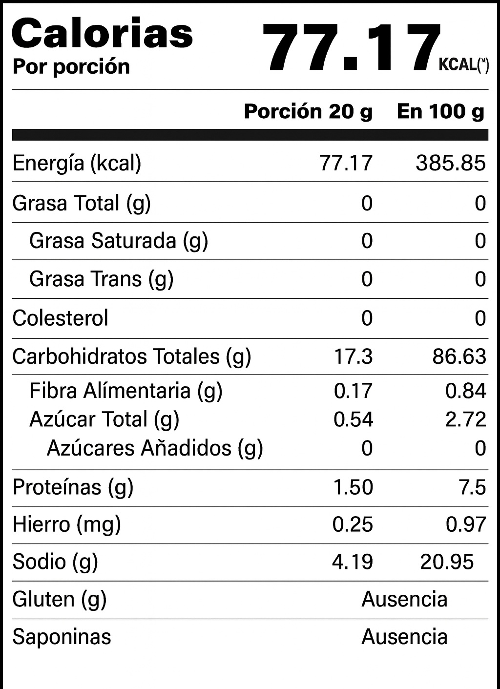 MACA, CACAO, MAIZ, QUINUA, KIWICHA, ARROZ, CANELA. YACON, PROBIOTICO, BETAGLUCANO